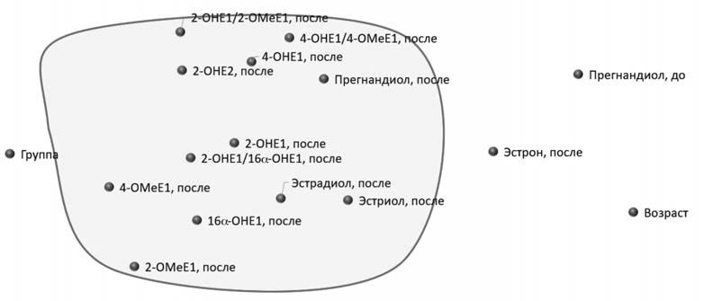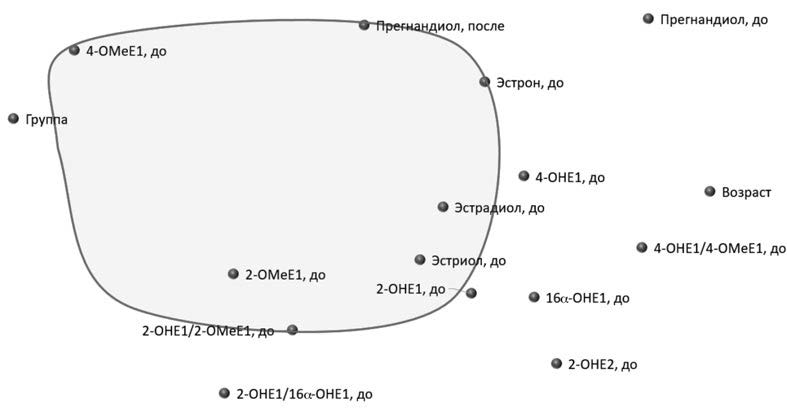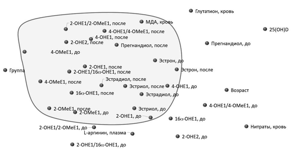 Примечание. Расстояние между любой парой точек на диаграмме соответствует степени «взаимодействия» показателей: чем ближе точки, тем сильнее взаимодействуют (коррелируют) соответствующие показатели. Практически все метаболиты эстрогенов вошли в центральный кластер взаимодействий параметров. «Группа» – числовой параметр, отражающий основной диагноз пациентки (0 – контрольная группа, 1 – ФКМ, 2 – РМЖ).