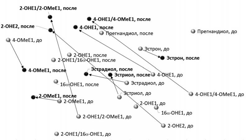 В течение 1 мес пациентки с ФКМ получали 7-HMR по 30 мг 2 раза в сутки. В результате приема 7-HMR отмечены комплексные изменения концентраций метаболитов эстрогенов в суточной моче. Для представления динамики этих изменений в целом мы построили метрические карты, точки которых соответствуют определенным метаболитам (рис. 2).
