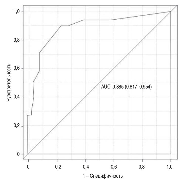 Для определения диагностической ценности модели применен ROC-анализ [16] и построена ROC-кривая (см. рисунок) [17].