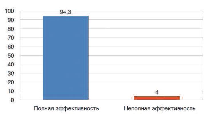 При оценке эффективности через 2 нед после терапии выявлена высокая эффективность лечения: у 165 (94,3%) пациенток лечение препаратом оказалось эффективным, и только у 7 пациенток терапия не дала полного эффекта (4%). У 3 (1,7%) пациенток наблюдалась аллергическая реакция на компоненты препарата, что послужило причиной отказа от лечения Тержинаном (рис. 1).