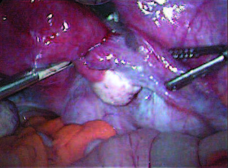 Рис. 2. Вскрытие листка широкой связки в месте наиболее выступающей части образования.