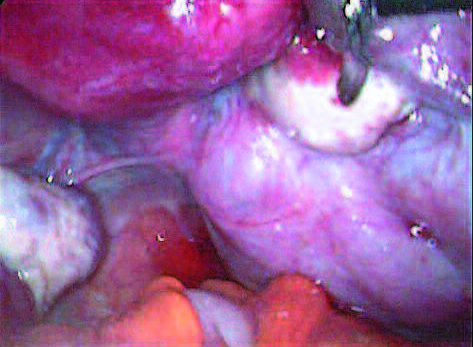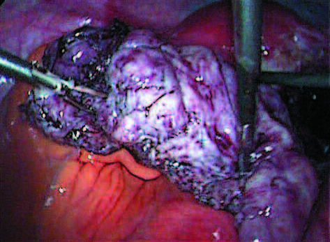 Визуальный эндоскопический осмотр показал наличие незначительного спаечного процесса между органами малого таза, а также наличие опухолевидного образования, вероятно, связанного с маткой, расположенного между листками широкой связки справа и доходящего до правой боковой стенки малого таза. Указанное образование было расценено как миоматозный узел, имеющий интралигаментарное расположение (рис. 1).