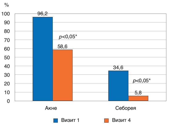 Как представлено на рис. 2, через 6 мес наблюдения выявлены следующие статистически значимые изменения в состоянии кожных покровов: снижение частоты встречаемости акне с 96,2 до 68,6% (р=0,0000) и себореи с 34,6 до 5,8% (р=0,0000).