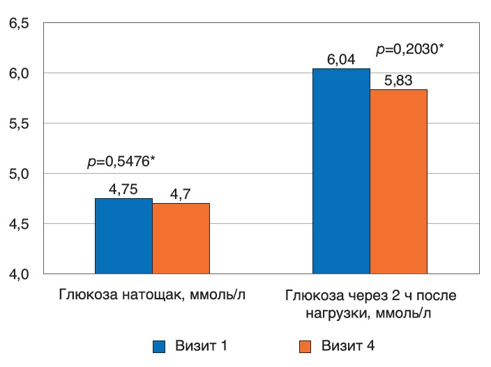 Средний уровень глюкозы через 2 ч после углеводной нагрузки снизился статистически незначимо с 6,0 до 5,8 ммоль/л, что также находилось в пределах референсных значений; однако число женщин, имевших нарушение толерантности к глюкозе, уменьшилось с 19,2 до 0% (р=0,0000).