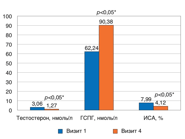 Все оцениваемые нами показатели андрогенного статуса (общий тестостерон и ИСА) через 6 нед оказались статистически значимо ниже исходного уровня и находились в пределах референсных значений (рис. 4).