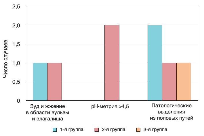 В ходе проведенного обследования в послеоперационном периоде пациентки распределены на 3 группы: в 1-ю группу (n=20) вошли пациентки с подтвержденным диагнозом «вульвовагинальный кандидоз», 2-ю группу (n=20) составили пациентки с бактериальным вагинозом и 3-ю группу (n=20) – с цитолитическим вагинозом.