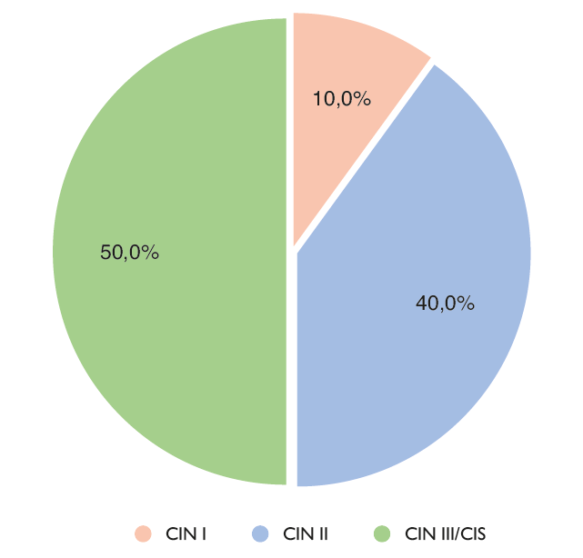 Морфологическое исследование операционного материала, полученного в результате радиохирургической манипуляции, выявило более тяжелую патологию шейки матки в 13 (21,7%) из 60 случаев: у 3 (50,0%) из 6 больных с предварительным диагнозом CIN I обнаружены CIN II (2 случая) и CIN III (1 случай), а у 10 (41,7%) из 24 пациенток с CIN II – CIN III/СIS. Таким образом, использование многоступенчатой высокочастотной (3,8–4,0 МГц) радиоволновой хирургической лечебно-диагностической манипуляции на шейке матки позволило адекватно оценить степень тяжести цервикального патологического процесса и реализовать раннюю диагностику внутриэпителиального РШМ у женщин репродуктивного возраста.