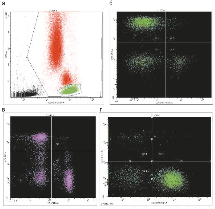 Рис. 2. Цитометрический анализ субпопуляционного состава лимфоцитов. Анализ образца периферической крови, больная М., 1978 года рождения: а – выделение лимфоцитарного гейта на основании экспрессии CD45 антигена (CD45+ клетки-лейкоциты выделены красным, лимфоциты Р2 выделены зеленым цветом); б – оценка количества CD3+ Т-клеток (верхний левый квадрант) и CD16+56+ NK-клеток (правый нижний квадрант); в – анализ количества CD8+ Т-цитотоксических лимфоцитов (верхний левый квадрант) и CD4+ Т-хелперов (правый нижний квадрант), двойных позитивных CD4+CD8+ (верхний правый квадрант) клеток; г – цитометрический анализ количества CD19+ В-лимфоцитов (верхний левый квадрант) и CD3+ Т-лимфоцитов (правый нижний квадрант).