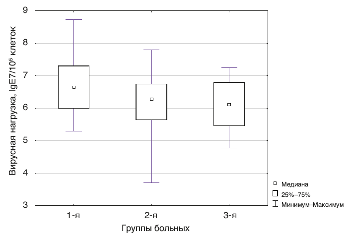 Вирусная нагрузка у ВПЧ-позитивных больных CIN I–III была высокой, ее средний уровень составил 6,22±0,98 lgЕ7/105 клеток. Средний уровень вирусной нагрузки в группах значимо не различался: 6,7±1,0, 6,1±1,0, 6,1±0,8 lgЕ7/105 клеток соответственно в 1, 2 и 3-й группах (p=0,33); рис. 3.
