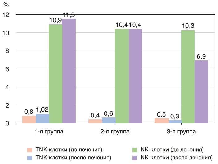Изучение особенностей субпопуляционного состава лимфоцитов в анализируемых группах до лечения показало снижение относительного количества минорной популяции TNK-клеток (CD3+CD16+CD56+). Относительное содержание данной популяции во всей анализируемой группе было ниже пороговых значений в 53,7% случаев. Это указывает на разбалансированность функций иммунитета и диктует необходимость проведения корригирующей иммунотерапии.