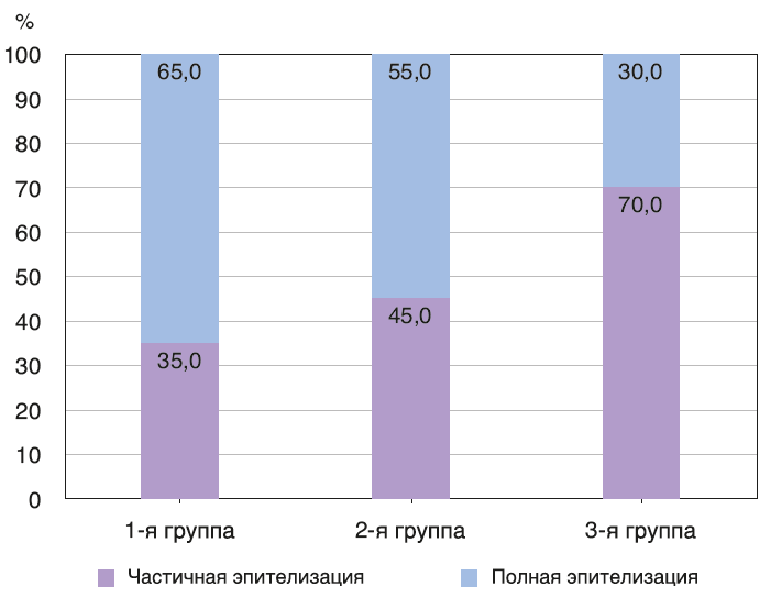 Рис. 5. Уровень эпителизации культи шейки матки у больных в зависимости от проведенного лечения на сроке 1 мес.