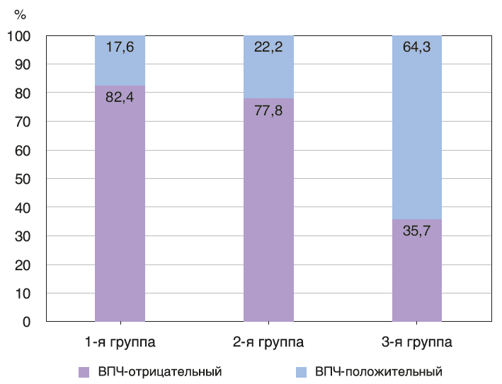 Уровень ВПЧ-инфицированности в группах был сопоставим: 85,0% (17), 90,0% (18) и 70,0% (14) случаев – соответственно в 1, 2 и 3-й группах (p>0,05). Частота встречаемости ВПЧ-16 в группах также не имела значимых различий – у 76,5% (13), 83,3% (15) и 64,3% (9) ВПЧ-инфицированных больных соответственно 1, 2 и 3-й групп (p>0,05).