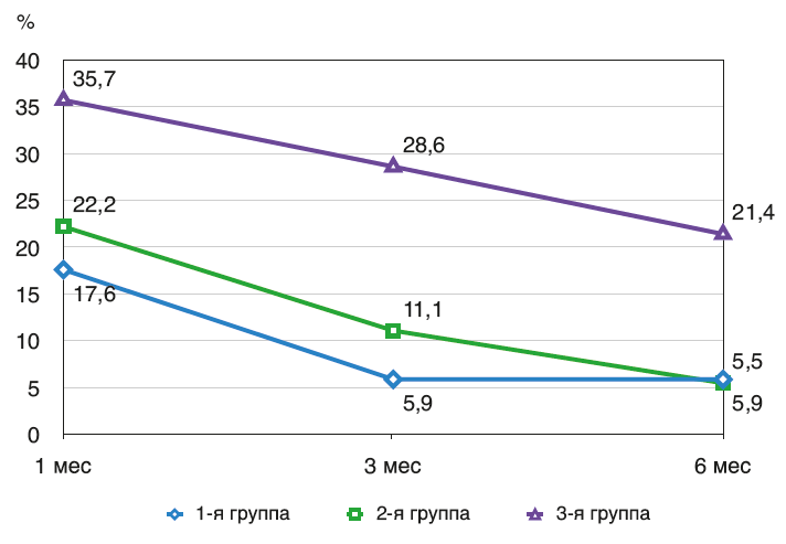 При мониторинге через 1 мес ВПЧ ВКР выявлен у 12 (24,5%) из 49 ВПЧ-инфицированных больных. Уровень средней вирусной нагрузки был значимо ниже по сравнению с аналогичным показателем до лечения – 3,7±1,8 lgЕ7/105 против 6,7±1,1 lgЕ7/105 (p=0,01). Наиболее часто сохранение персистенции вируса наблюдалось в группе больных, которым выполнялось только хирургическое лечение – в 35,7% случаев, что оказалось в 1,5–2 раза выше по сравнению с группами с использованием противовирусного препарата совместно с радиохирургическим вмешательством – 17,6 и 22,2% соответственно в 1 и 2-й группах (рис. 6).