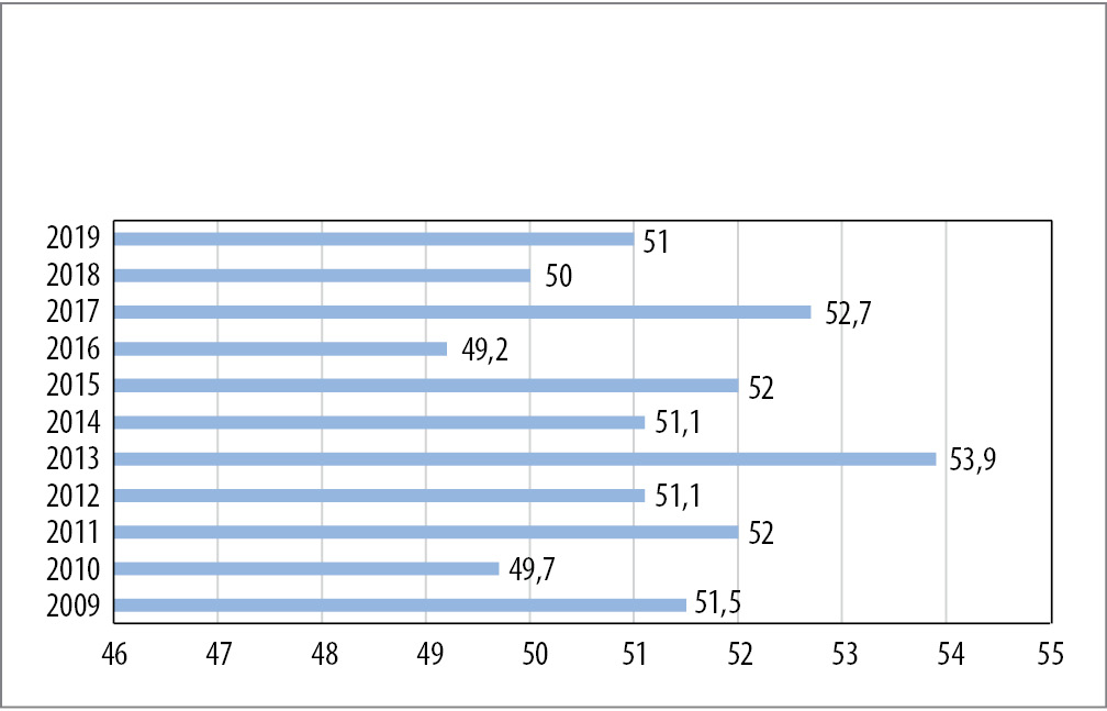 Рис. 3. Показатель выявления ранних и запущенных форм РШМ в РФ (2009–2019 гг.).