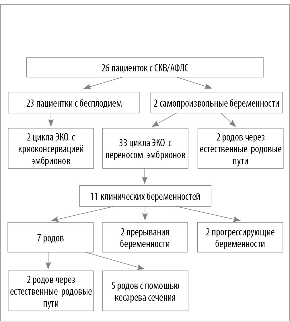 Всем пациенткам проведено комплексное клинико-лабораторное обследование на базе ФГБУ «НМИЦ АГП им. акад. В.И. Кулакова», они также наблюдались у ревматолога ФГБНУ «НИИ ревматологии им. В.А. Насоновой» до, через 1–3 мес после включения в программу ВРТ, а также в течение всей беременности. Ими подписано информированное согласие на участие в исследовании. Критериями включения в исследование являлись: достоверный диагноз СКВ (согласно критериям EULAR/ACR, 2019) и/или АФЛС (согласно Саппоровским критериям, 2006) [14], проблемы с реализацией репродуктивной функции, возраст от 18 до 42 лет. Критерии невключения: недостоверный диагноз СКВ и/или АФЛС, возраст более 42 лет.