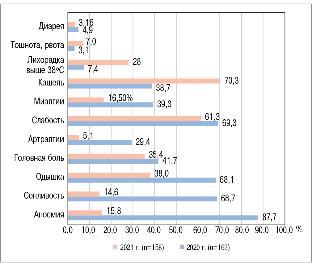 В 1-й год эпидемии у беременных с наибольшей частотой встречались такие клинические симптомы НКИ, как: потеря обоняния – аносмия (87,7%), слабость (69,3%), сонливость (68,7%), одышка даже при легкой степени поражения легких (68,1%), головная боль (41,7%), боли в суставах (29,4%). В 3-ю волну 2-го года пандемии COVID-19 клиническая картина претерпела существенные изменения, и преобладающими симптомами стали кашель (70,3% vs 38,7%; χ2=26,1, р<0,001), насморк (46,2% vs 3,7%; χ2 =78,2, р<0,001), боли в горле (36,7% vs 3,7%; χ2=28,9, р<0,001); чаще регистрировалась лихорадка выше 38ºС (19,6% vs 7,4%; χ2=8,0, р=0,006). Статистически значимо реже стали отмечаться потеря обоняния (15,8% vs 87,7%; χ2=95,7, р<0,001), сонливость (14,6% vs 68,7%; χ2=39,6, р<0,001), одышка (38,0% vs 68,1%; χ2=29,3, р<0,001), боли в мышцах (39,30% vs 16,5%; χ2=20,7, р<0,001) и суставах (10,1% vs 29,4%; χ2=17,8, р<0,001). В сравниваемые периоды эпидемии с равной частотой встречались слабость (61,3% vs 69,3%; χ2=4,6, р=0,039), головная боль (35,4% vs 41,7%; χ2=1,7, р=0,254), тошнота, рвота (3,1% vs 7,0%; χ2=2,6, р=0,129), диарея (4,9% vs 3,2%; χ2=0,6, р=0,574); рис. 1.