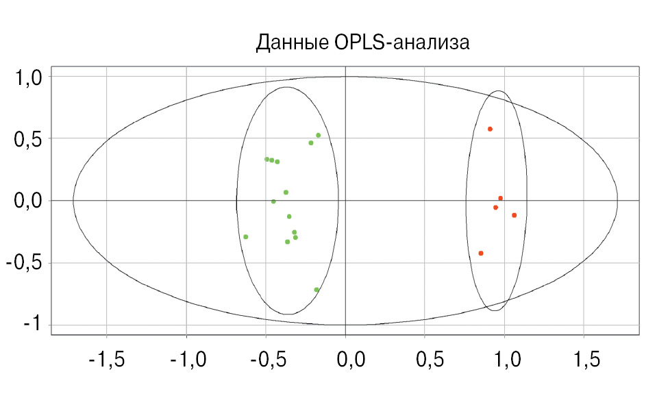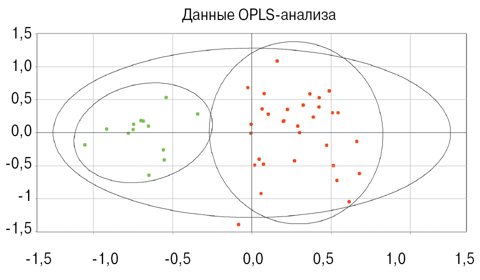 На рис. 1 представлен график счетов построенной OPLS-модели. Зеленые точки соответствуют наблюдаемым из группы контроля, красные точки – пациентам с РЯ I–IV стадии по FIGO. На графике счетов наблюдается четкая группировка точек в 2 кластера вдоль первой главной компоненты. На качество созданной статистической модели указывают рассчитанные для нее характеристики. Оценочный параметр модели R2, который отображает долю данных, описанных созданной моделью с использованием скрытых переменных, достиг 0,87 и превышает нижнюю допустимую для этой величины границу, равную 0,5. Оценочный параметр Q2, показывающий ожидаемую точность прогнозирования новых данных, поднялся до значения 0,80, что выше допустимой границы, равной 0,4, более чем в 2 раза. Чувствительность и специфичность ROC-кривой этой OPLS-модели достигли 1. Таким образом, данная модель может быть использована для отнесения анализируемых образцов к той или иной клинической подгруппе.