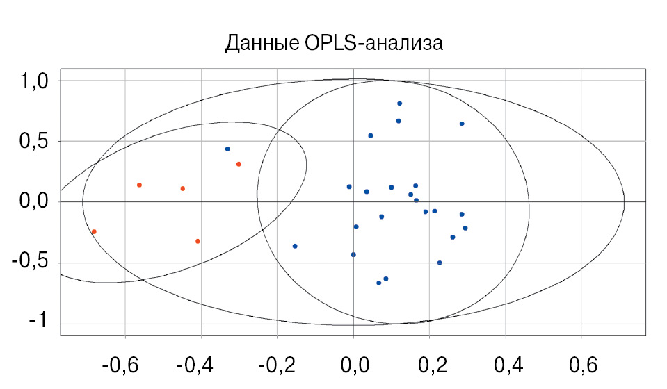 Полученные данные подверглись дискриминантному анализу ортогональных проекций на скрытые структуры (OPLS-DA) с предварительным масштабированием по Парето [10]. Затем произведены оценка чувствительности и специфичности, а также ожидаемой точности классификации новых показателей для определения диагностической ценности этой классифицирующей модели и анализ важности вклада независимых переменных в проекции (VIP – variable importance in projection), полученных в OPLS-моделях. Для идентификации соединений, наиболее существенных для создания фенотипической классификации в исследовании, использовали их точную массу и характерные тандемные масс-спектры.