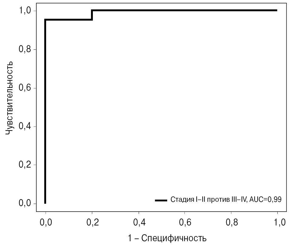 На рис. 3 представлен график счетов, построенный по результатам OPLS-анализа МС-данных, полученных в режиме положительных ионов для образцов из групп РЯ Ia–Ic (красные точки) и IIa–IVa стадии (синие точки). В данной модели VIP>1 было у 99 липидов. ROC-анализ модели (рис. 4) показал, что ее чувствительность равна 0,96, специфичность 1 и AUC=0,99.