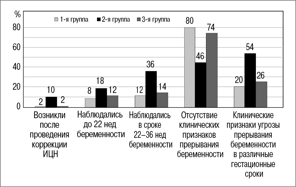 Все пациентки подписывали информированное согласие на определенный вид коррекции ИЦН. Следует также отметить, что всем пациенткам после коррекции ИЦН рекомендовалось длительное применение (до 34 нед гестации) препарата, относящегося к микронизированному прогестерону (Утрожестан®).