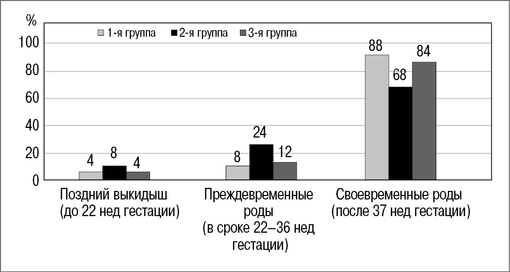 Родоразрешение в доношенном сроке прошло у 44 (88%), 34 (68%) и 42 (84%) пациенток по группам соответственно (рис. 5). Прерывание беременности до 22 нед беременности ввиду некорригируемой сократительной деятельности матки наблюдалось у пациенток из всех групп, однако наименее редко данный исход беременности встречался у пациенток 1 и 3-й групп по сравнению с пациентками 2-й группы. Вместе с тем особое внимание обращает тот факт, что наиболее благоприятные исходы беременности зафиксированы в 1-й группе, т.е. у пациенток, у которых для коррекции ИЦН использовался разработанный нами способ.
