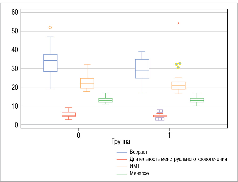 Рис. 1. Распределение различных параметров пациенток в исследуемых группах. / Fig. 1. Distribution of various patient parameters in the study groups.
