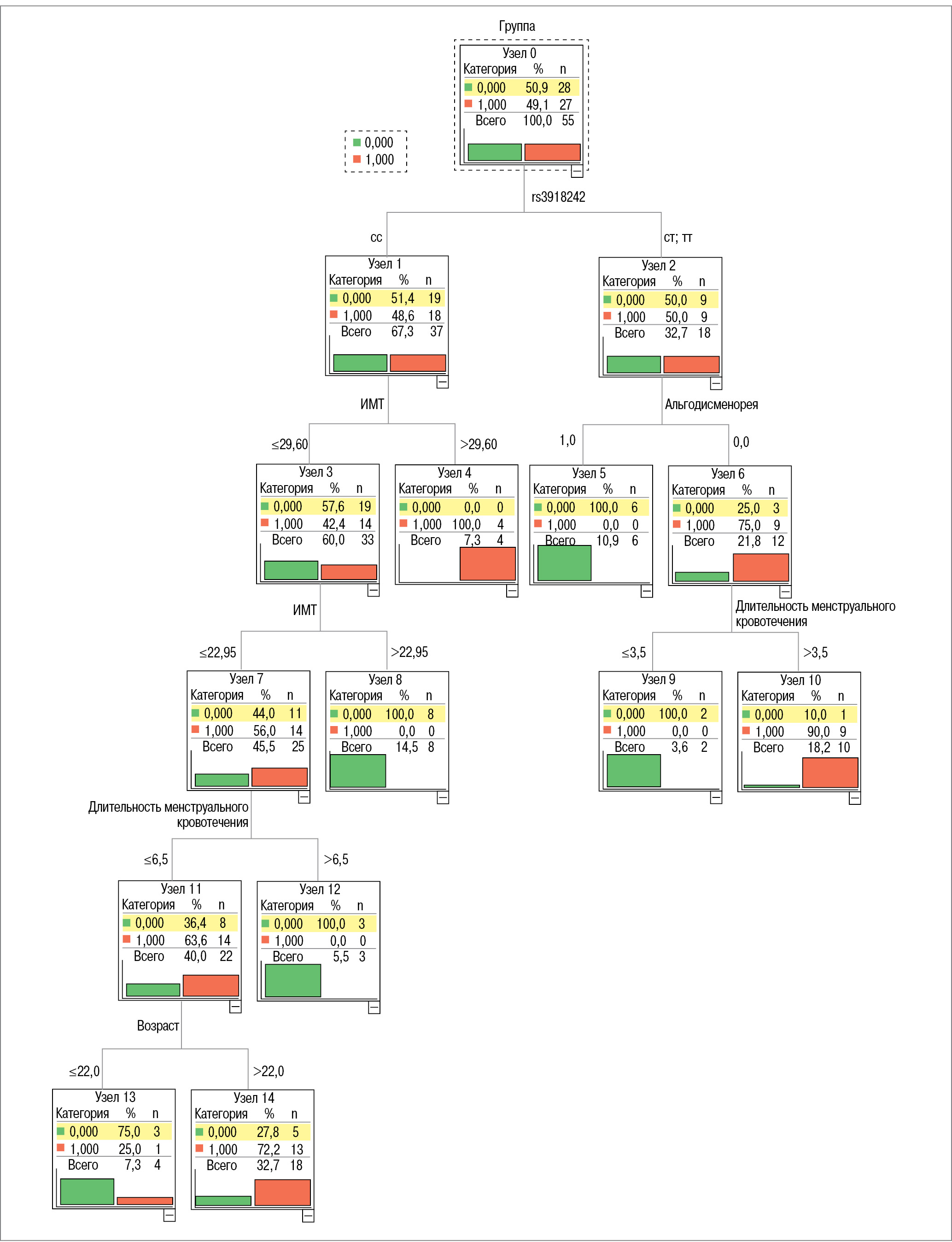 Для оценки значимости различных вариантов генотипов в вероятности наступления определенного исхода применялся метод «Дерево решений» (рис. 2). В результате произведенных расчетов сделан вывод, что возникновение ЭКЯ возможно предположить у пациенток с генотипом СС и ИМТ>29,6 (узел 4 на рис. 2), а также у женщин в возрасте старше 22 лет с генотипом СС, ИМТ≤22,95 и длительностью менструального кровотечения менее 6,5 дня (узел 14 на рис. 2). Такой же вероятный исход можно ожидать у пациенток с генотипом СТ или ТТ, не страдающих альгодисменореей и имеющих длительность менструального кровотечения более 3,5 дня (узел 10 на рис. 2). Чувствительность и специфичность этого вывода составляет 81 и 96% соответственно.