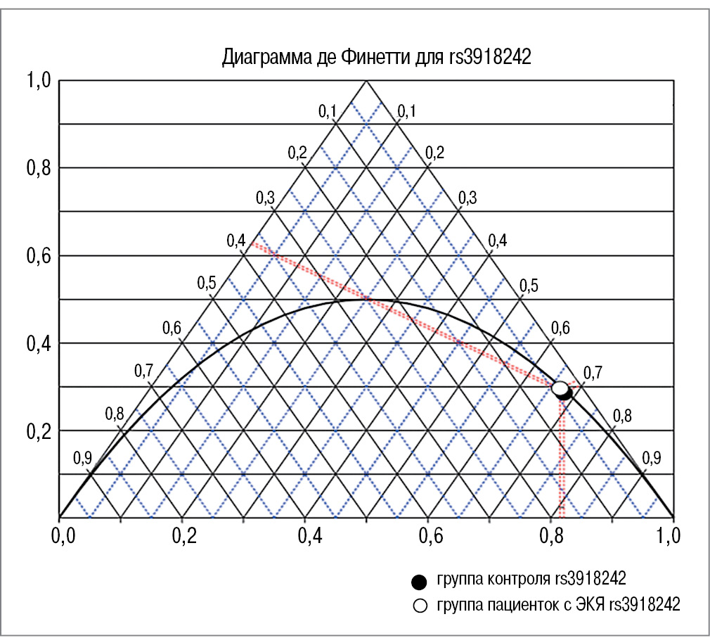Частоты всех исследованных авторами генотипов металлопротеиназы ММР-9 С(–1562)Т гена ММР-9 в группе пациенток с ЭКЯ и группе контроля находятся в равновесии Харди–Вайнберга (р=0,99 и 0,43 для 1 и 2-й группы соответственно); рис. 5.