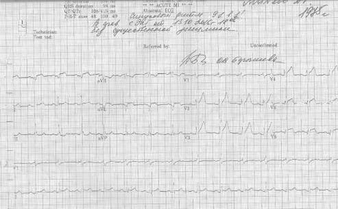 На ЭКГ: синусовый ритм, правильный с частотой сердечных сокращений 90 в минуту, РQ – 0,16 c, QRS – 0 c, QT – 0,36 c, регресс R V1–6, высокий зубец Т V2–3; qrS I, QSaVL, QrV5–6; подъем ST в I,aVL,V3–V6; депрессия STIII, aVF. Заключение: признаки ОИМ передневерхушечной и боковой стенки левого желудочка (ЛЖ). ЭКГ представлена на рис. 1.