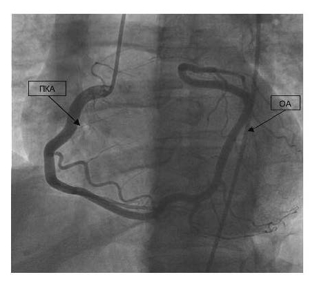 По экстренным показаниям выполнена коронароангиография. Заключение: аномалия развития КА. Единственная КА отходит от правого коронарного синуса. Правая КА (ПКА) формирует переднюю межжелудочковую артерию (ПМЖА), огибающую артерию (ОА). ПМЖА с ровными контурами заполнения, на границе среднего и дистального сегментов окклюзирована. Постокклюзионное русло удовлетворительно заполняется по внутрисистемным коллатералям. ОА и ее ветви с ровными контурами наполнения, без стенозов. ПКА отдает конусную ветвь, ветвь к правому желудочку, ветвь острого края, заднее – боковые ветви (ЗБВ 1 и ЗБВ 2 ПКА) и заднюю межжелудочковую ветвь ПКА, ПКА и ее ветви с ровными контурами наполнения, без стенозов. Заключение: аномальное развитие КА – единственная КА. Окклюзия ПМЖА на границе среднего и дистального сегментов.