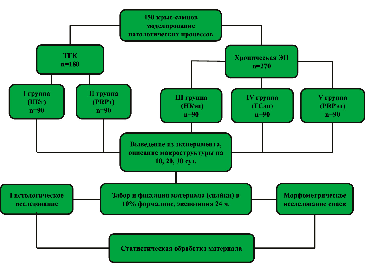 Эксперимент выполнен на 450 нелинейных половозрелых крысах-самцах (сток), массой 280-300 г, которые содержались в стандартных условиях вивария, с естественной сменой суточного цикла, свободным доступом к экструдированному корму и воде. Содержание и манипуляции проводились в соответствии с приказом Минздрава СССР №755 от 12.08.1977 г. и Европейской Конвенцией о защите позвоночных животных, используемой для экспериментов или в других научных целях (Страсбург, 18 марта 1986 г.) [8, 9]. Положительное заключение на экспериментальные исследования Локального независимого этического комитета Волгоградского государственного медицинского университета получено 29.09.2016 г., протокол №12-2016.