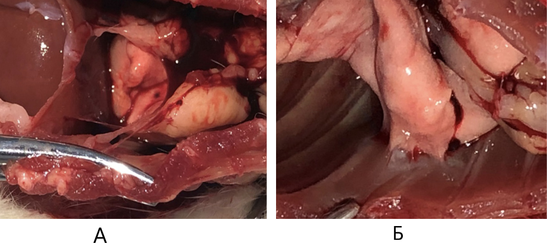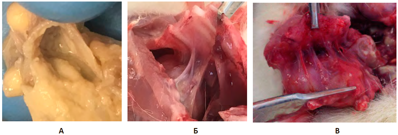 On the 20th day of the experiment, consolidation of rib fragments was recorded in 66.7% of the animals in the negative control group with chest trauma (without pharmacological correction) and in 77.8% in the experimental group. Adhesions in the negative control group with chest trauma (without pharmacological correction), as in the previous period of the experiment, were predominantly formed in the area of surgical trauma (in 43.3%) and were represented by arachnoid and membranous adhesions (Fig. 3A).