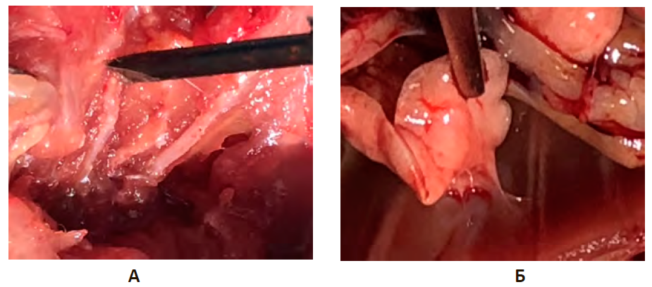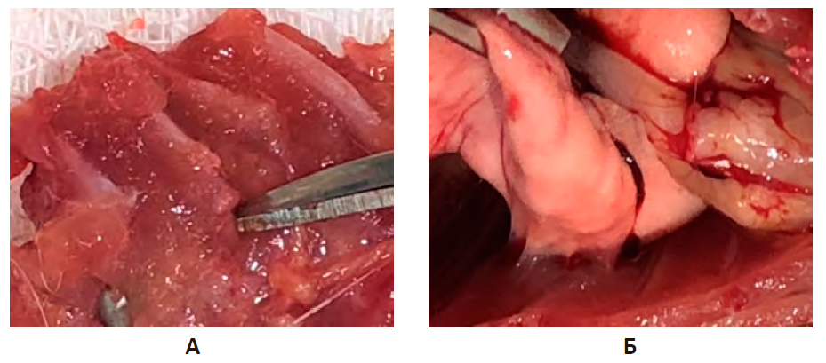 В результате сравнительного анализа опытной группы и группы негативного контроля установлено, что на 10-е сутки эксперимента при ТГК не было отмечено случаев консолидации переломов ребер. В группе НКт спаечный процесс отсутствовал в 16,7% случаев, в 36,7% спайки образовывались локально, исключительно в зоне операционной травмы и были представлены белесоватыми полупрозрачными тяжами (паутинные спайки), рис. 2А.