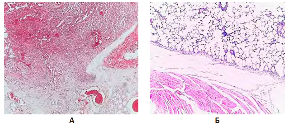 Note: A. Negative control group. The presence of consolidation of rib fractures, the absence of intrapleural adhesions. B. Experimental group. Administration of platelet-rich plasma (PRPt). Formation of plane adhesions.
