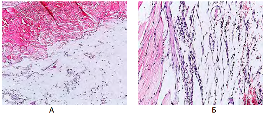 Примечание: А. Группа НКт. Окраска гематоксилином и эозином. Ув. ×100. Б. Опытная группа PRPт. Окраска гематоксилином и эозином. Ув. ×200.