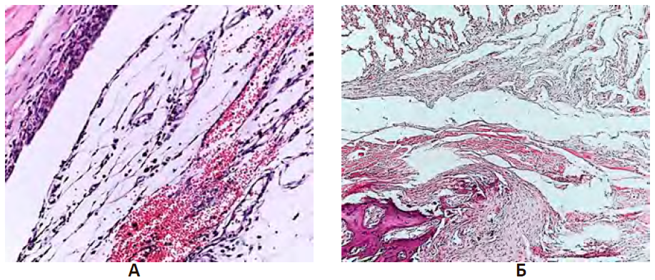 On the 10th day of the experiment, thin fibers of connective tissue, located unevenly, mainly in the zone of fracture and drug administration, were determined in the experimental group. The amount of exudate was insignificant, its organization was notified against the background of a persisting inflammatory reaction (Fig.5B).