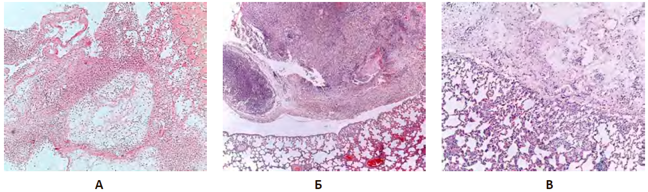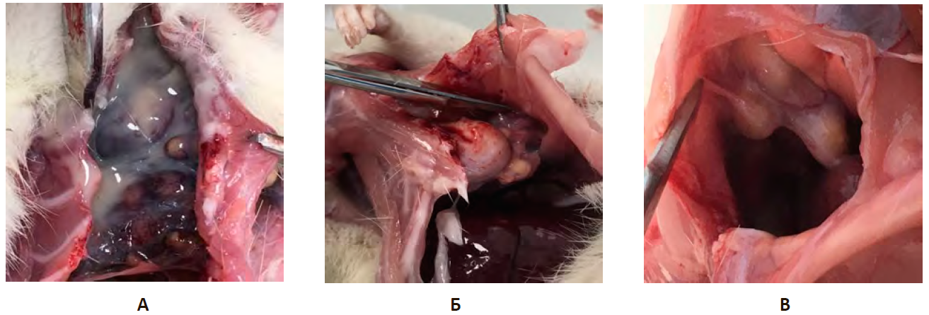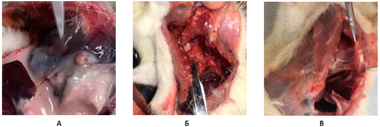 Примечание: А. Группа негативного контроля (НКэп). Полость заполнена жидким гноем, множественные абсцессы. Б. Группа сравнения (ГСэп). В. Опытная группа (PRPэп).