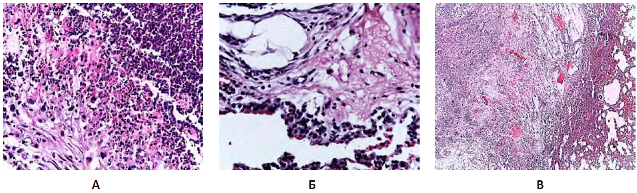 On the 10th day of the experiment in the pleural cavity in the NCpe group, the impregnation of the pleural layers with purulent fibrinous exudate was determined; the involvement of adjacent tissues in the pathological process was detected. Deposits of fibrin filaments were determined in the inflammatory detritus of the exudate. In the parietal pleura, reactive changes, characterized by the phenomena of nuclear hyperchromia and violations of the nuclear-cytoplasmic relationship, were found out. The inflammatory infiltrate was represented by an abundance of polymorphonuclear neutrophils with single lymphocytes and macrophages (Fig. 11A).