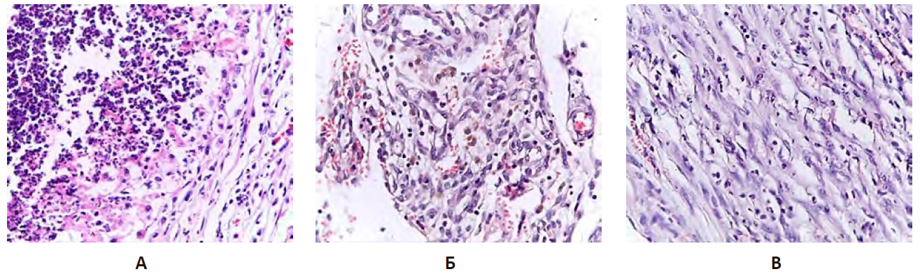 Note: A. NCpe group. Staining with hematoxylin and eosin. Magnification x100. B. Comparison group. Staining with hematoxylin and eosin. Magnification ×100. C. Experimental group (PRPpe) with the administration of platelet-rich plasma. The phase of young adhesions with the presence of immature connective tissue against the background of chronic pleural empyema in rats on day 20 with the administration of platelet-rich plasma. Staining with hematoxylin and eosin. Magnification ×100.