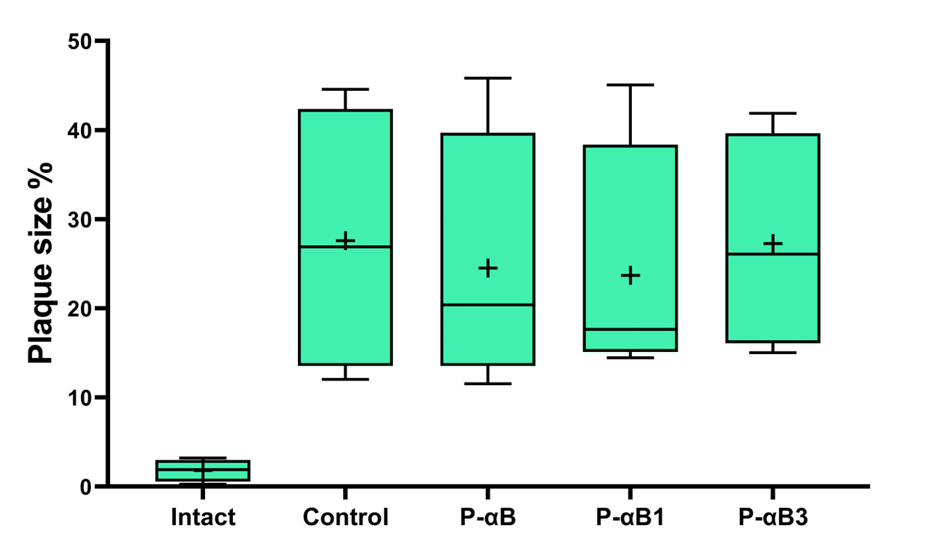 At the same time, the degree of damage varied greatly within the groups, which made it difficult to interpret the results obtained. As a result, no significant differences between the control group and the groups using the tested drugs have been found, although a certain tendency to reduce the area was observed in the group using P-αB1 (Fig.3).