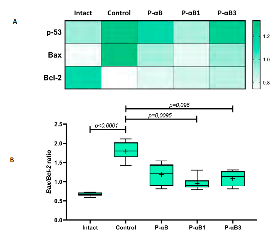 For an integral assessment of the pro-apoptotic orientation of tissues, the ratio of Bax expression to Bcl-2 was calculated. The average calculated Bax/Bcl-2 ratio was 0.67 in the group of the intact animals, 1.81 in the control group, 1.19 in the group treated with P-aB, 0.96 in the group treated with P-αB1 and 1.09 in the group treated with P-αB3 (Fig. 4B).