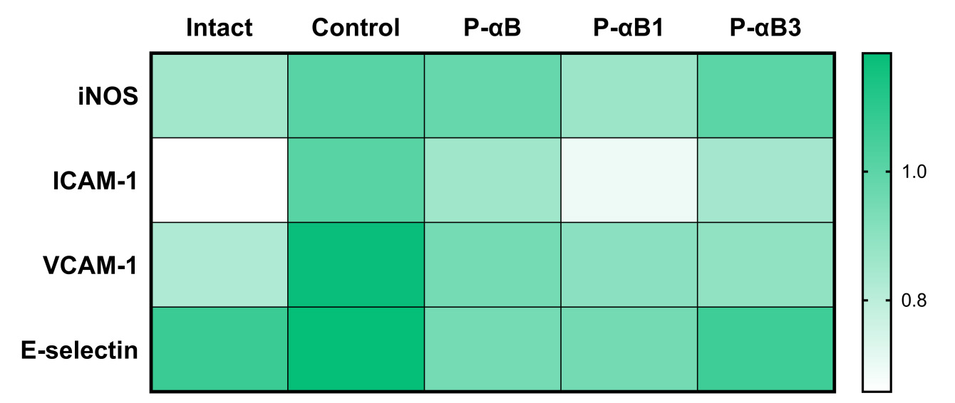 Along with the anti-apoptotic effect, the studied drugs decreased the expression of the genes for inflammatory marker Nos2, and molecules of intercellular adhesion Icam1, Vcam1, and E-selectin, which had been increased against the background of trauma. The most pronounced effect was obtained in the group treated with the P-αB1 compound (Fig. 5).