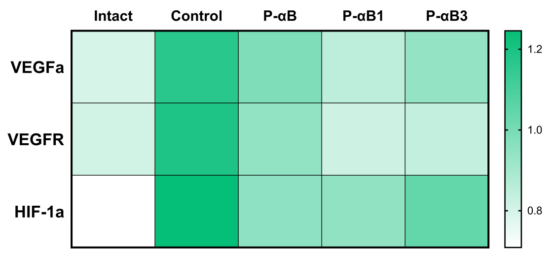 Using a molecular biological analysis of plaque tissues, it was found out that the studied peptides significantly reduce the expression of pro-apoptotic factors Bax, caspase-1 and caspase-3, and also slightly increase the expression of antiapoptic factor Bcl-2. As the heat map in Fig. 2 shows, the greatest effect was demonstrated by preparation P-αB1 (Fig.4A).