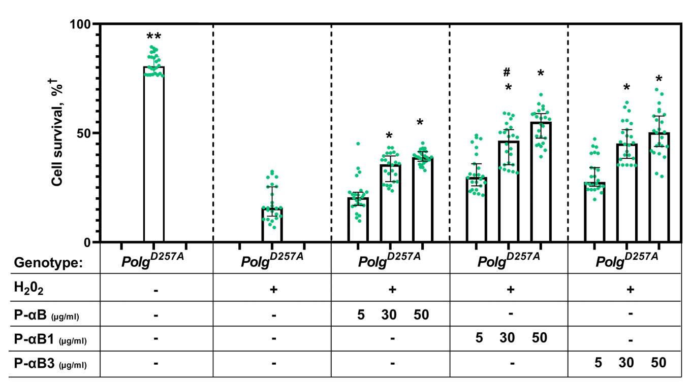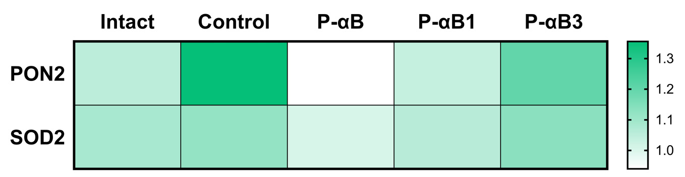 Finally, against the background of modeling atherosclerosis in Polg-D257A/Cdh5-CRE mice, it was found out that an increase in the expression of the genes of the antioxidant enzymes Pon2, Sod2 occurs. At the same time, in comparison with the control, the expression of the antioxidant system genes was reduced against the background of the use of the tested peptides. As well as in assessing the effect of peptides on pro-inflammatory and pro-angiogenic genes, the most pronounced effect was obtained in the group treated with the P-αB1 compound (Fig. 7).