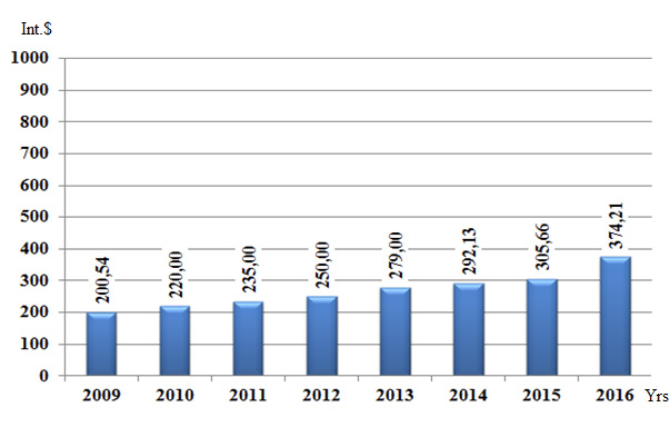 Figure 3 – Per capita expenditures on medicines in Lebanon in 2009–2016, in international dollars