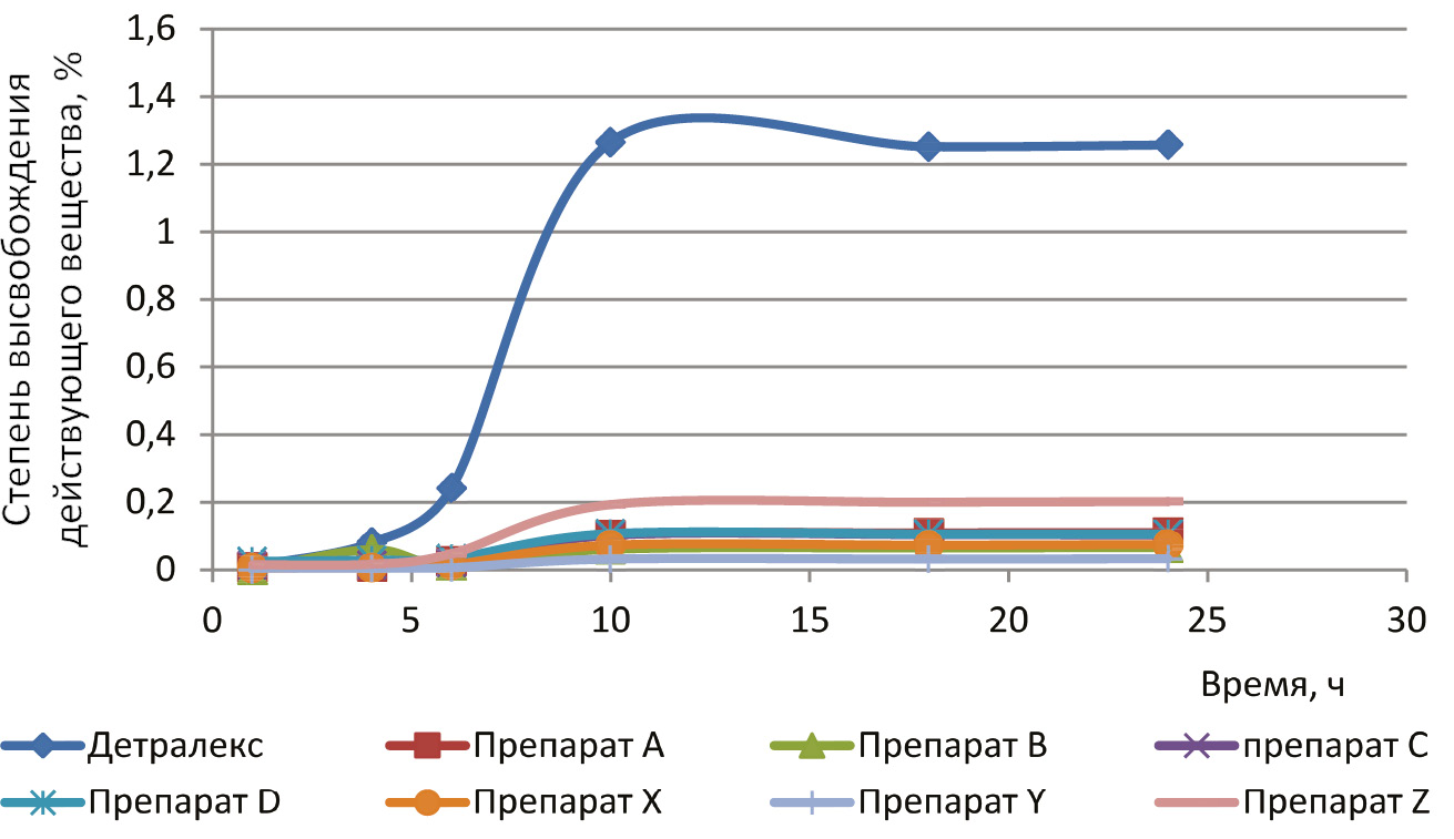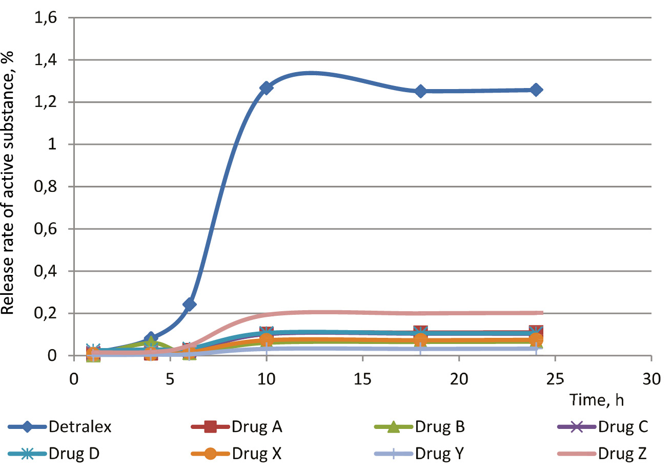 The studied biopharmaceutical profiles and, accordingly, revealed differences in the release rates suggest that the Detralex® formula, as well as the features of its manufacturing process (micronization) provide, in a comparative aspect, a higher bioavailability of diosmin and hesperidin. After 24 hours, it is at least 6 times larger than that of the other studied drugs (in general, no more than 0.2%), in particular of the drug Z, and, as a maximum, 38 times larger than that of the drug Y.