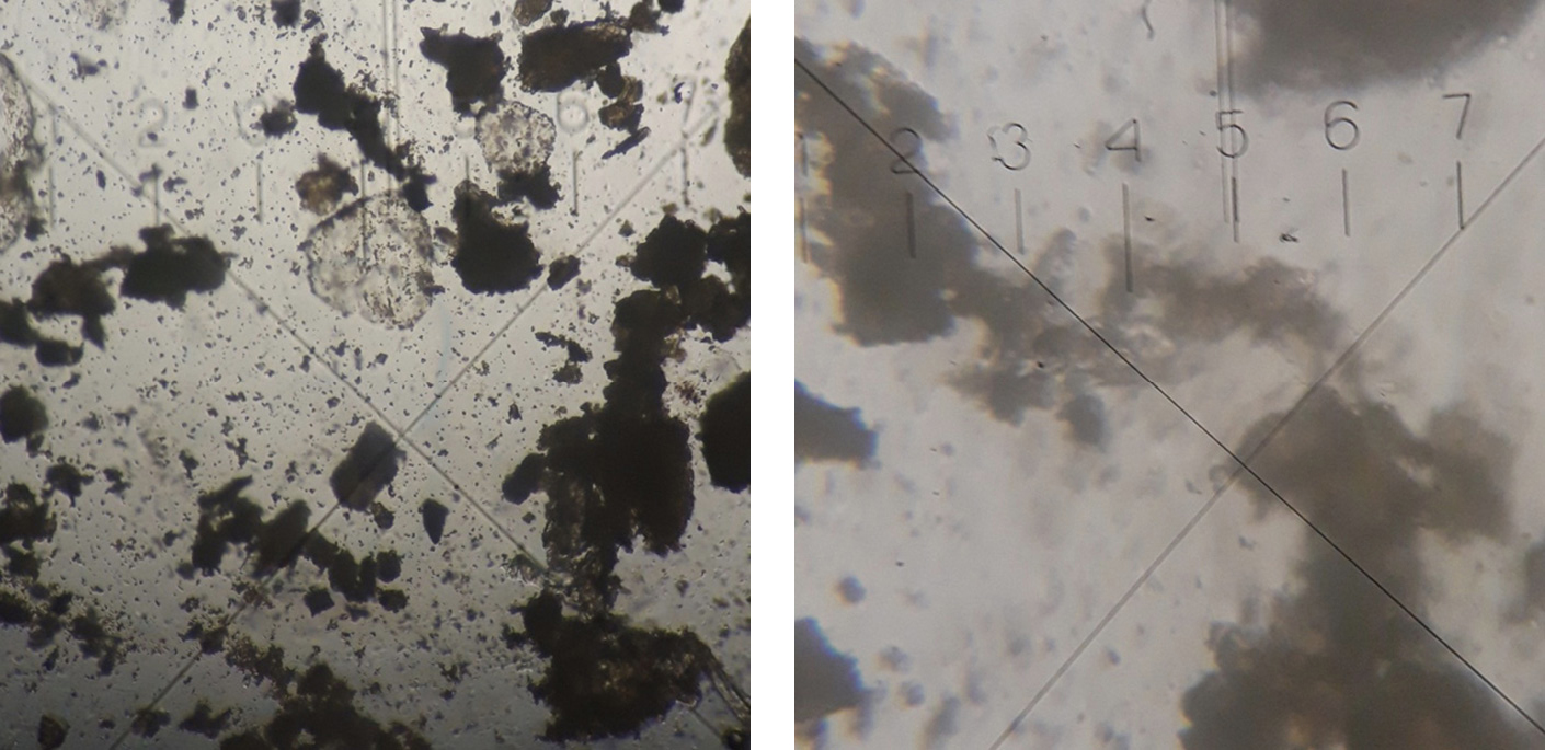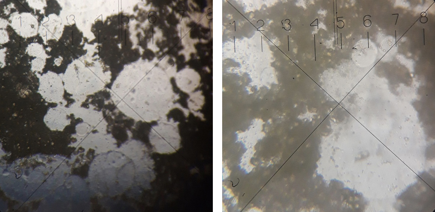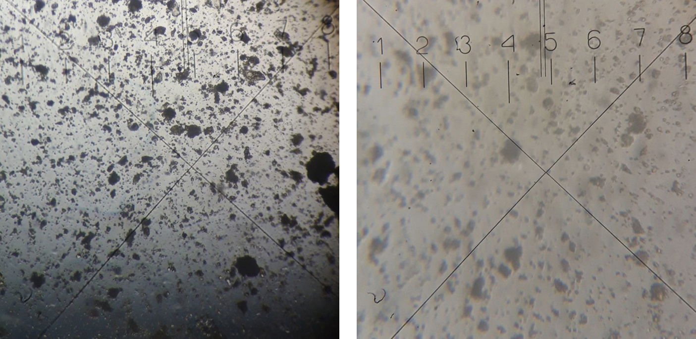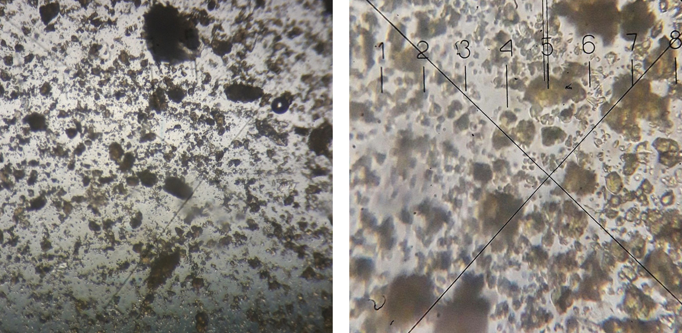 where: t is the particle size, mm; II–I is the difference between two readings on the scales of the ocular microscope, mm; β is the linear magnification of the objective lens 15×40=600.