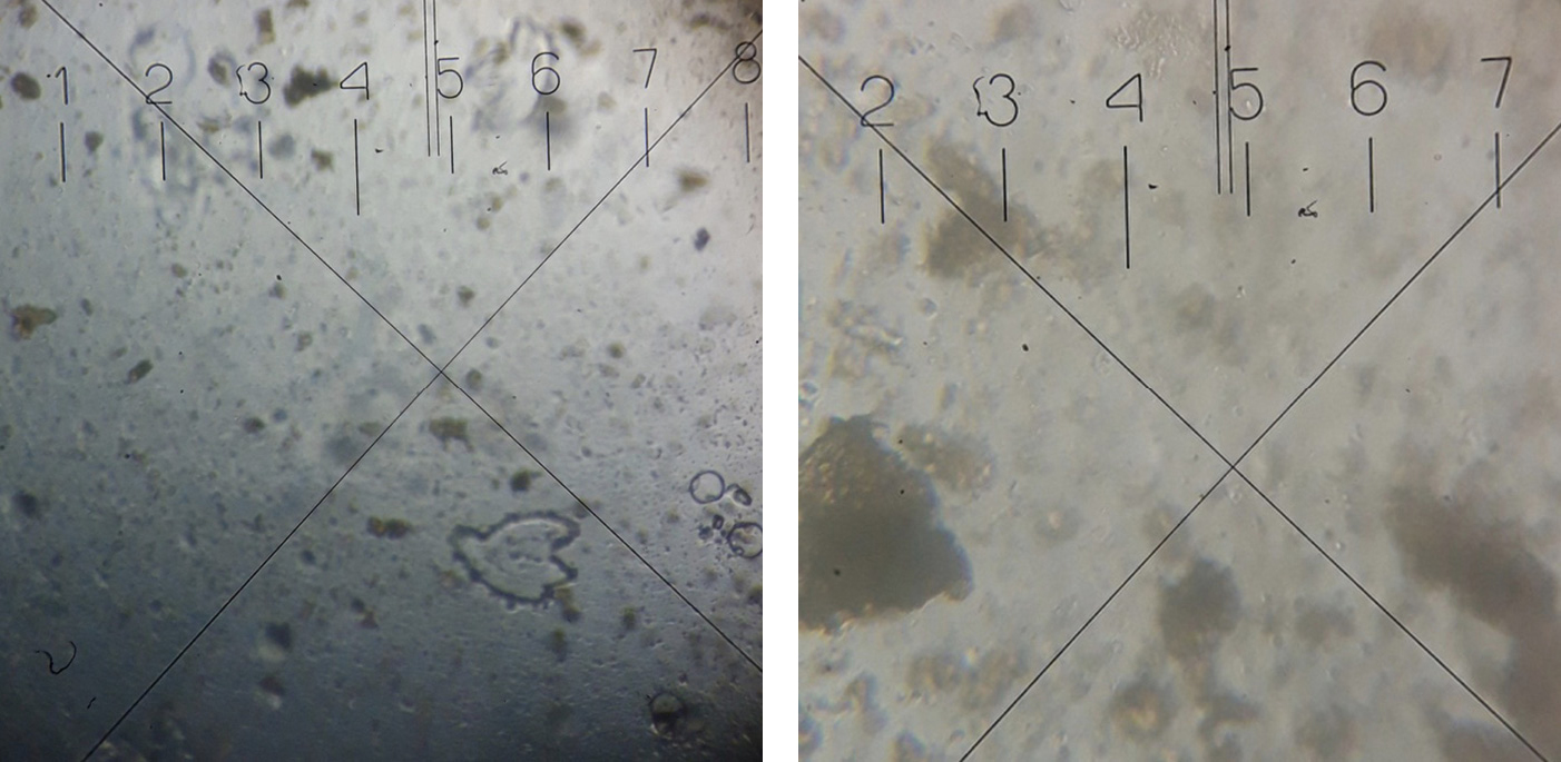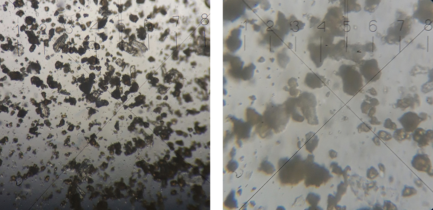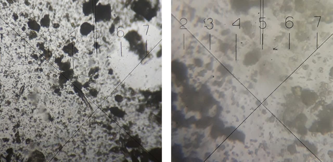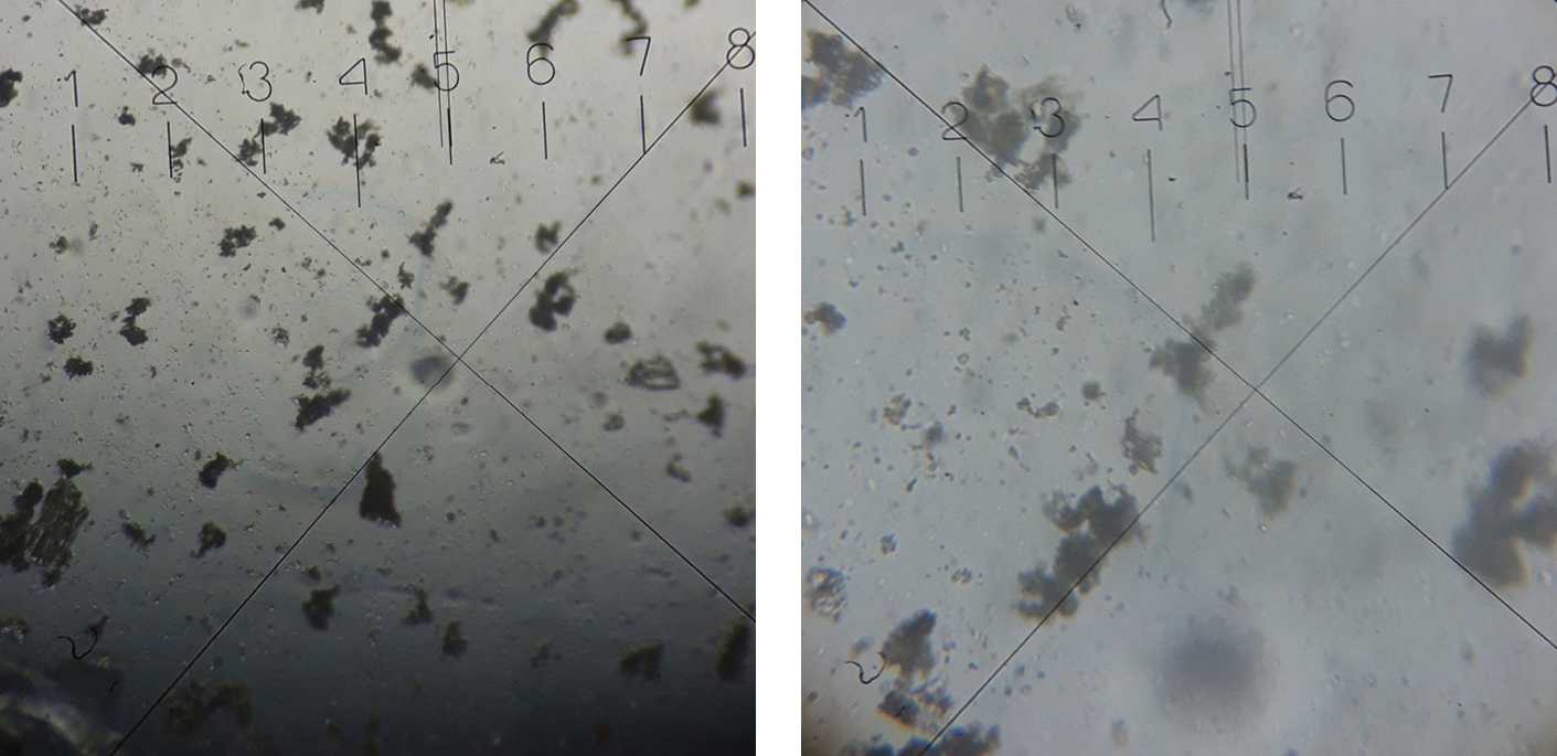 where: t is the particle size, mm; II–I is the difference between two readings on the scales of the ocular microscope, mm; β is the linear magnification of the objective lens 15×40=600.
