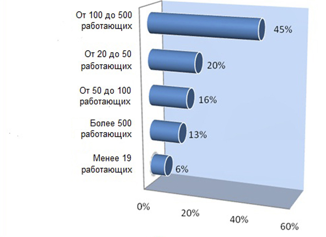 В опросе приняли участие 111 специалистов фармацевтической отрасли, возврат анкет составил 11,3%. Около трети респондентов (35%) были в возрасте до 40 лет, 15 процентов – старше 55 лет. Более половины респондентов работают на средних и крупных фармацевтических предприятиях (45% и 13%), остальные – на малых предприятиях и микроорганизациях, что в целом отражает структуру российской фармацевтической промышленности (рис. 1).