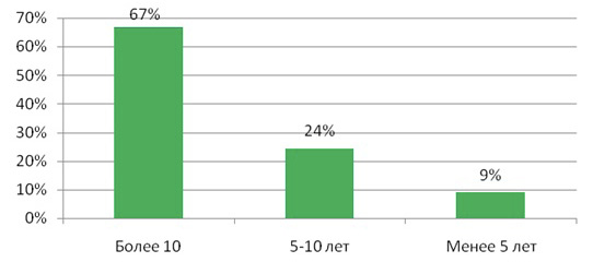 Большая часть респондентов (63%) работают на предприятиях, выпускающих лекарственные средства химического происхождения, имеют стаж работы на фармацевтическом предприятии более 10 лет (67%) (рис. 2).